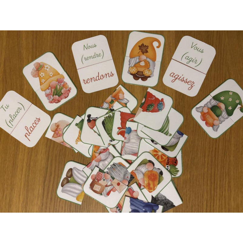 Assemble les deux moitiés de la carte (pronom et infinitif sur une moitié,verbe conjugué sur la deuxième) et retourne pour vérifier ta réponse... si tu trouves un lutin, ta réponse est correcte.
