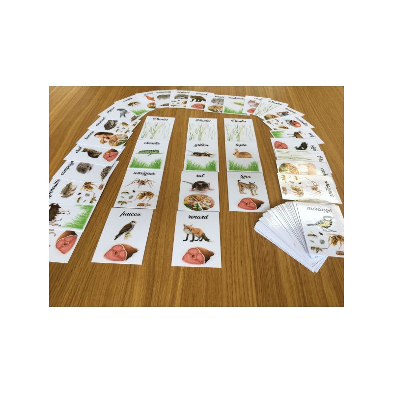 Un jeu qui vous permettra de travailler sur les chaines alimentaires. Au début de la partie, chaque enfant reçoit 5 cartes. Lorsqu'il peut combiner au minimum 3 cartes pour créer une chaine alimentaire, il la dépose sur la table. Les autres joueurs peuvent alors compléter sa chaine en y insérant une ou plusieurs de leurs cartes. Si un joueur ne peut pas réaliser ou compléter de chaîne, il pioche une carte dans le tas. Le vainqueur est celui qui s'est débarrassé de toutes ses cartes en premier. Le fichier comprend les cartes de jeu et leur verso.