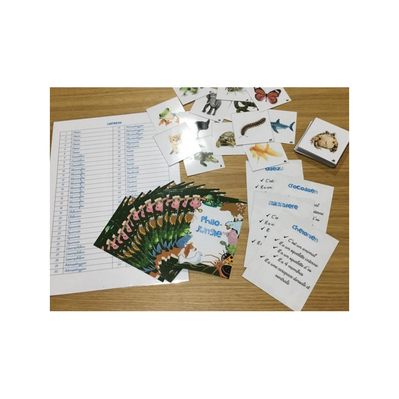 Philo-Jungle est un jeu pour s'entraîner avec le nouveau classement phylogénétique des animaux. Le but du jeu est de se débarrasser de ses cartes animaux (on en a 7 au départ). Pour cela, il faut que l'animal corresponde à la famille dont la carte d'identité a été retournée. Si on se trompe, on récupère toutes les cartes posées ! Un doute ? Il y a un correctif ! Le fichier comprend : - les cartes d'identité des familles - les cartes animaux - un correctif - les règles du jeu