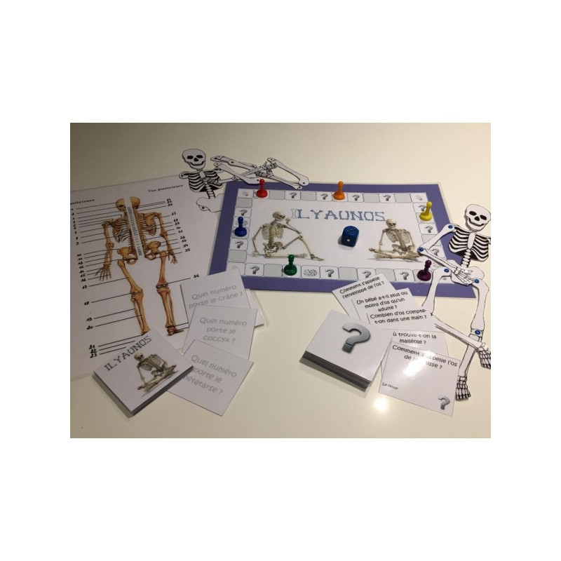 Un jeu de plateau qui va vous permettre de réviser le squelette et ses principaux os. On avance son pion sur le plateau, on répond à des questions ou on situe des os sur le squelette et on remporte des morceaux d'un pantin squelette en cas de bonne réponse. Le fichier comprend : - le plateau de jeu, - les cartes questions avec les correctifs, - un modèle de pantin (à reproduire autant de fois que de joueurs) - la fiche squelette matériel supplémentaire à prévoir : pions et dé, attaches parisiennes.
