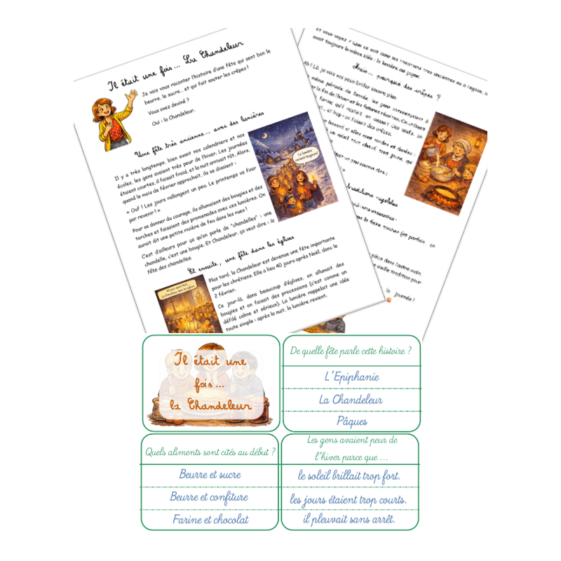 Un texte sympa et 31 questiosn sous forme de cartes à pince pour en vérifier la compréhension pour travailler sur les origines et les traditions de la Chandeleur.