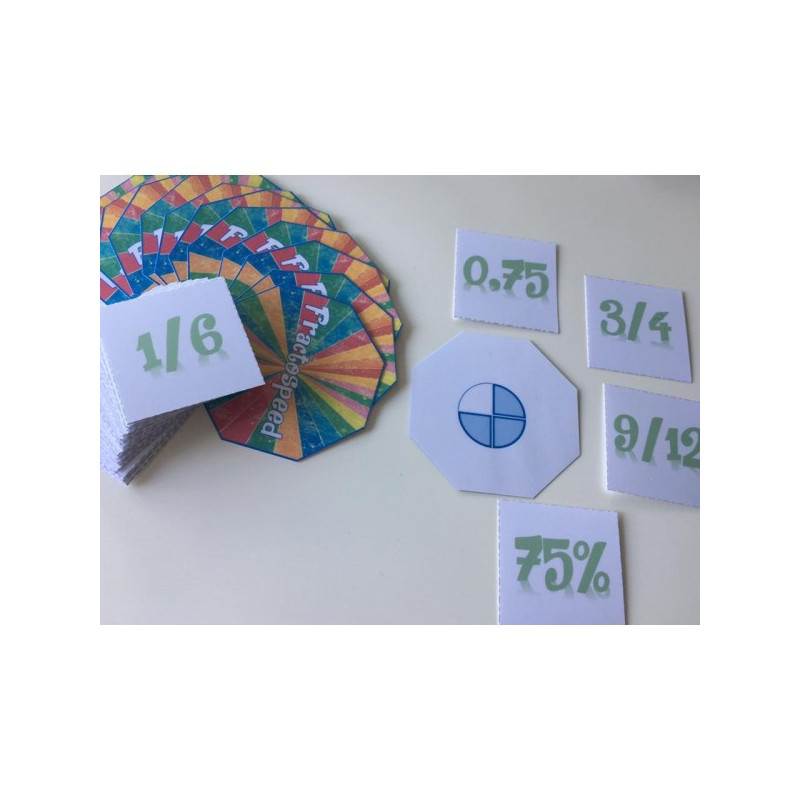 Un jeu pour travailler les équivalences des fractions/nombres décimaux/ pourcentages (ou lun des 3 en fonction des cartes choisies). Le but du jeu est de se débarrasser en premier de ses 7 cartes. Pour se défausser dune carte, il faut quelle soit équivalente à la fraction représentée au verso de la carte octogonale. Mais attention, en cas derreur, on récupère toutes les cartes déposées ! Un correctif permet aux enfants de jouer en autonomie