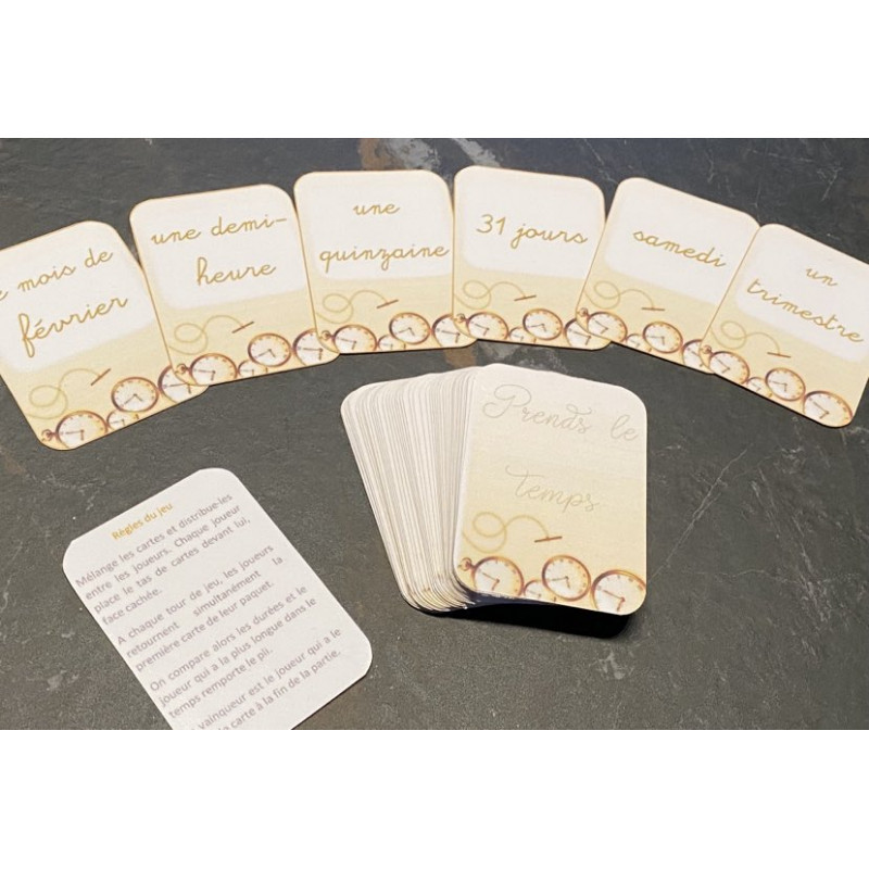 Un jeu de bataille dans lequel il faut comparer des durées. Celui qui pose la carte avec la plus longue durée remporte le pli. Le fichier comprend 44 cartes de jeu et les règles. Les cartes sont à imprimer sur papier cartonné avant de les plastifier et de les découper.