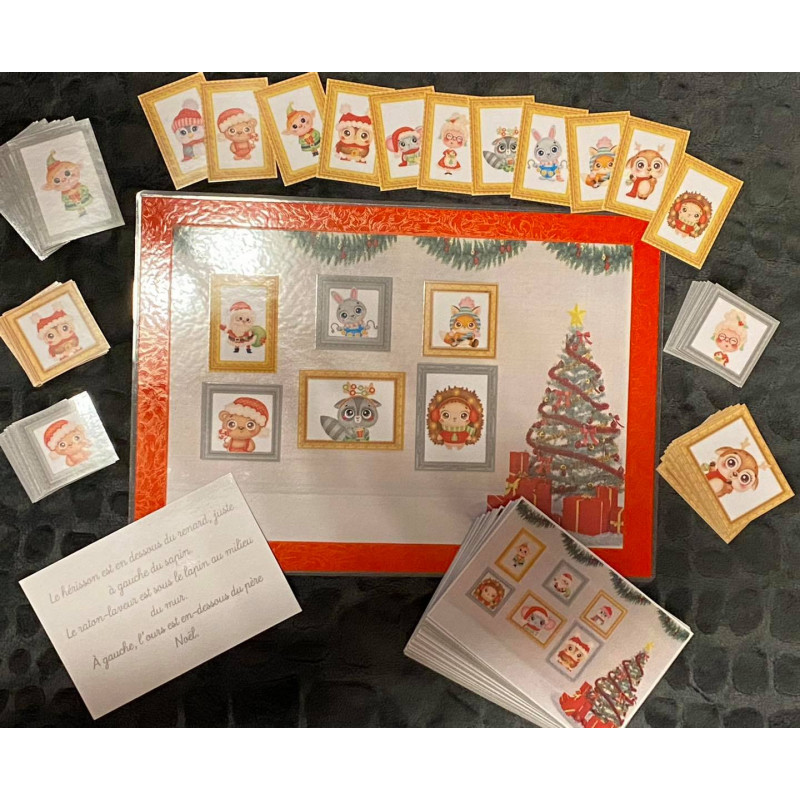 Un jeu qui peut s'adapter à tous les âges et qui travaille la structuration spatiale. Sur le plateau de jeu, l'enfant doit disposer les 6 cadres avec les animaux mais en suivant des consignes. Avec les petits, on pourra juste leur proposer la carte et ils devront reproduire le modèle. Avec les plus grands qui savent lire, on peut leur donner les consignes et le verso sert alors de correctif. On peut aussi travailler à l'oral : l'un des joueur doit expliquer à l'autre comment disposer les cadres en se servant uniquement du modèle.