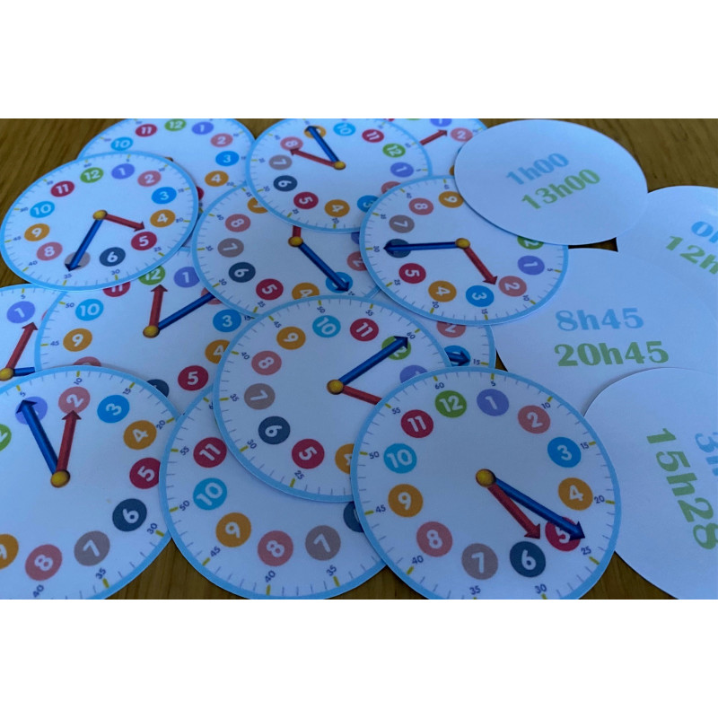 Ce jeu se joue seul ou à deux pour réviser la lecture des heures. Le fichier reprend 72 horloges réparties en catégories (heures pleines, demies-heures, quart d'heure, 3/4h et minutes). Vous pouvez donc choisir d'imprimer plusieurs fois la même page pour travailler une catégorie en particulier. Ce jeu est évolutif en intégrant peu à peu les nouvelles catégories apprises.