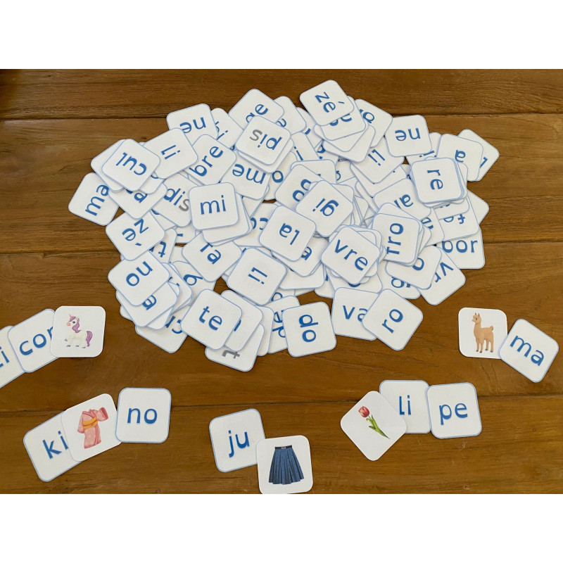 Etale toutes les syllabes simples sur la table et sélectionne celles qui vont te permettre de reconstituer un mot. Pour vérifier, tu peux retourner les cartes choisies. Si elles représentent le même dessin, tu peux garder les cartes syllabes. Sinon, tu les replaces avec les autres. Lorsqu'il n'y a plus de mot à former, compte les cartes obtenues par chaque joueur pour déterminer le gagnant !