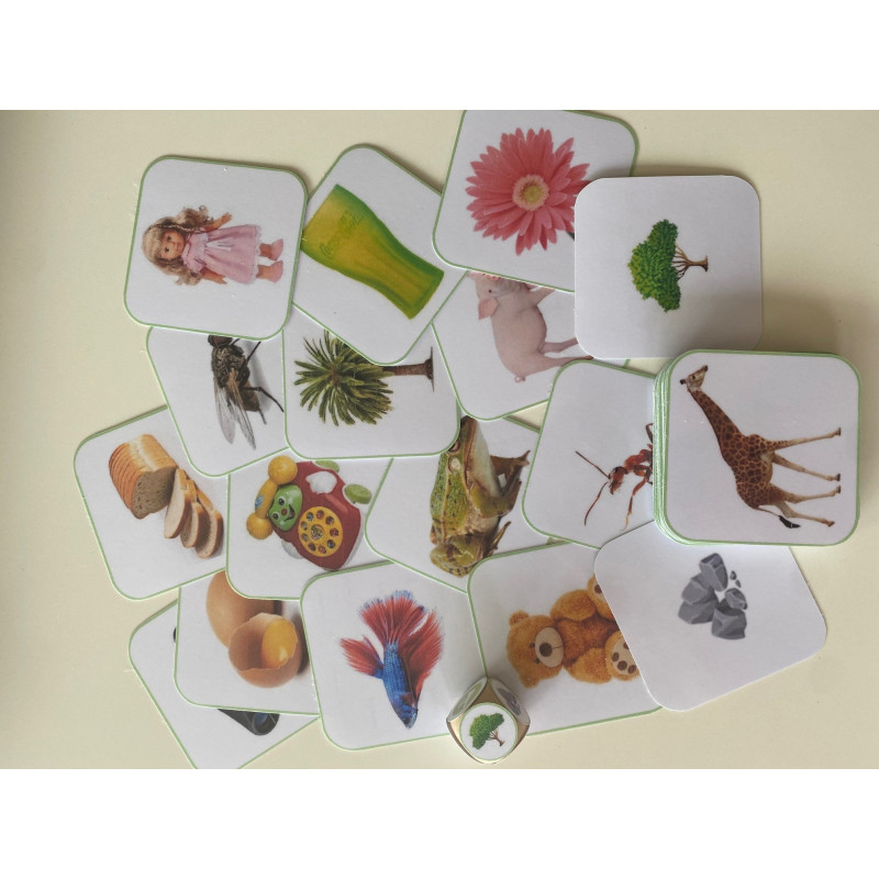 Etale les cartes sur la table, lance le dé et identifie une carte qui répond au critère vivant ou non-vivant. Bonus et malus rendront la partie plus fun !
